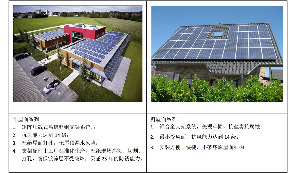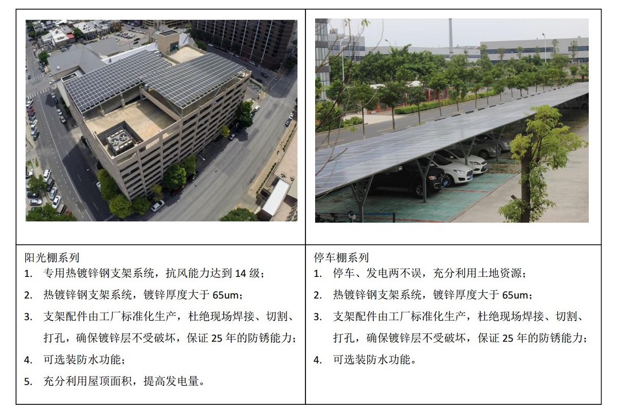 標(biāo)準(zhǔn)化熱鍍鋅鋼/鋁合金支架系統(tǒng),杜絕鋼結(jié)構(gòu)現(xiàn)場焊接、切割、打孔,全面保護支架鍍鋅保護層,確保支架系統(tǒng)25年抗腐蝕和抗臺風(fēng)能力。